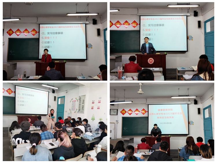 根据bat365毕业生实习相关要求和学院工作安排。4月2日,健康管理学院召开应用心理学专业2023届毕业生教育实习动员会,62名实习生将奔赴商洛中学、商洛市小学等7所中小学校,开展为期12周的教育实习。党总支书记鲁绵茸出席会议并讲话,实习指导教师、辅导员、2023届应用心理学专业全体毕业生参加动员会,会议由心理学系主任梁丰主持。