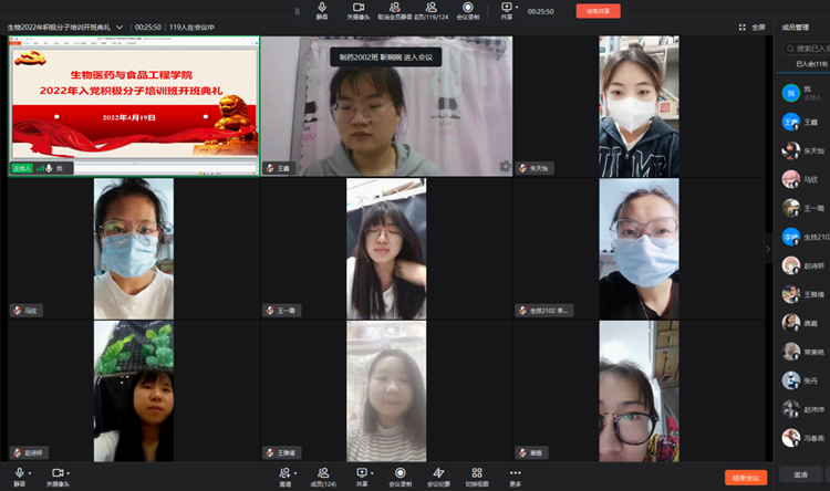 为切实做好入党积极分子的培训教育工作,进一步加深入党积极分子对党的认识,4月20日晚,生物学院依托线上平台举行2022年入党积极分子培训班开班典礼。院党委副书记赵永平、学生各党支部书记及120名培训班学员参加开班典礼。典礼由学生第二党支书记赵利君主持。