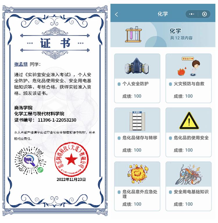 活动内容主要为慕乐网络开发的虚拟实验室安全知识考核,包括个人安全防护、火灾预防与自救、高温低温操作安全、玻璃器材使用安全、危化品储存与转移、危化品的使用安全、气瓶使用安全、废弃物的安全处理与管控、危化品意外应急处理、安全用电基础知识、高压釜使用安全、化工原理等实验室相关安全知识。学生以趣味通关的方式完成考核,闯关成功后即获得实验室安全考核合格证书。
