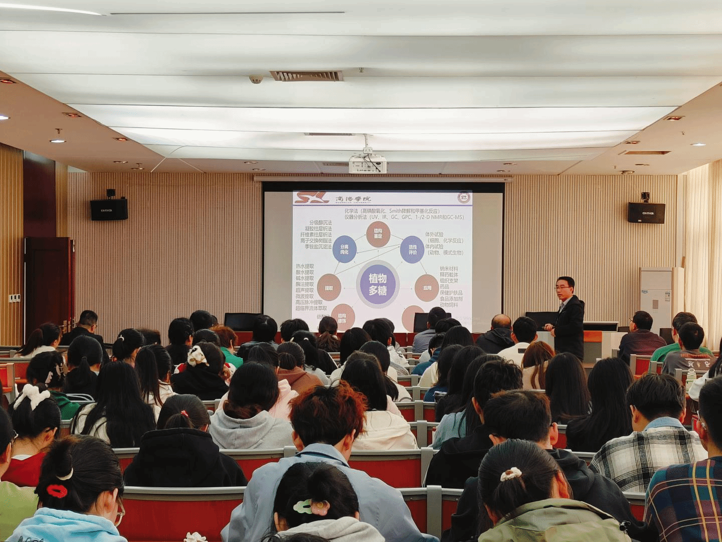 制药工程专业博士惠和平、陈淋分别作了报告。惠和平博士以“植物源多糖的化学结构及活性研究-以兰州百合多糖研究为例”为主题进行交流,重点介绍了兰州百合多糖的提取与纯化、化学结构研究、生物活性研究情况。陈淋博士以“猪苓干预UUO大鼠肾间质纤维化的作用机制研究”为主题进行交流,重点介绍了以猪苓为代表的利水渗湿药防治CKD的研究情况。