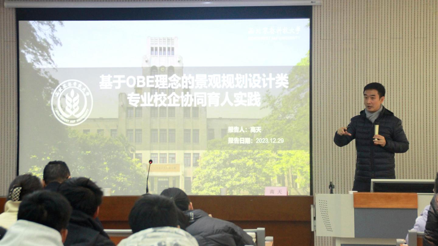高天教授结合自身从事(风景)园林专业教学和科研实践,分别以《基于OBE理念的景观规划设计类专业校企协同育人实践》《跨学科研究引领(风景)园林学科发展》为题,为师生们作了两场精彩的报告。他结合教学团队长期的教学改革实践和所取得的成果,从独特视角剖析了基于OBE理念的园林专业人才培养模式,并详细介绍了园林专业校企协同育人合作方式,基于项目落地的过程考核,科创项目和学科竞赛准备及参赛要点等。针对园林专业师生科研课题选择问题,提出围绕一种植物、针对一个点的T字型研究思路,并结合生态文明建设和乡村振兴分析了(风景)园林学科研究热点问题,激发了学生专业兴趣。