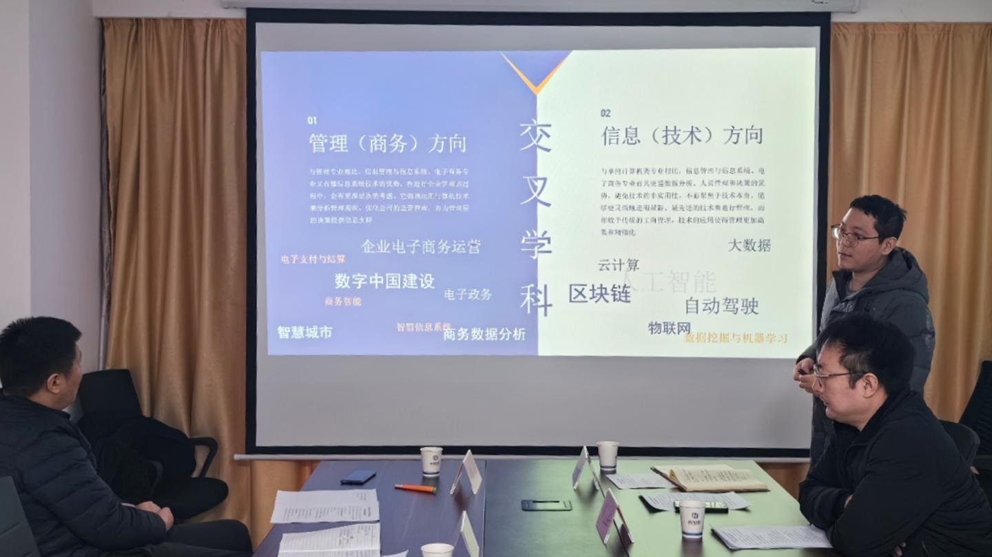 经管学院信息管理系主任任鑫博介绍了信息管理系信息管理与信息系统、电子商务两个专业的交叉学科背景,《Python与数据挖掘》《大数据技术应用》《商务数据分析》等多个具有大数据元素的课程内容和体系路线,分析了信息管理系两个专业在将传统专业与大数据有机结合,实现专业可持续发展及创新复合型人才的培养模式。