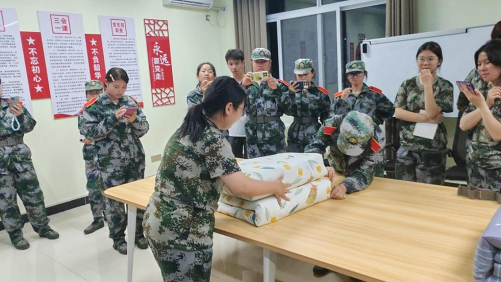 活动期间,教官为同学们讲解了《中国人民解放军内务条令》相关要求,围绕“宿舍物品放置方法”向同学们进行了耐心细致的讲授。教官表示,内务整理并不是简单的打扫卫生,它不仅是技能的学习,更是一种态度的体现,要时刻保持严谨与专注,从细节处塑造品格。活动现场,教官们向同学们现场演示了被褥、枕头整理和摆放,同学们通过认真听讲,结合教官教授的方法纷纷“上手”整理自己带来的被褥,并与自己的“作品”合影。这种寓教于乐的教学活动,丰富了军事技能训练的内容,进一步提升了军训工作的实效。