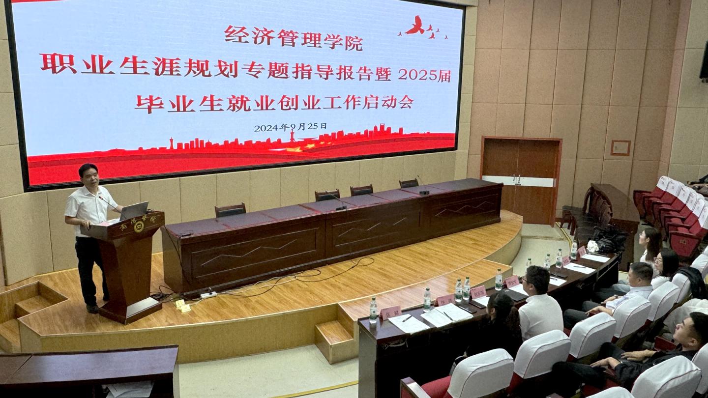 为引导2025届毕业生正确认识就业形势,推动毕业生实现高质量就业,9月25日下午,经济管理学院举办职业生涯规划专题指导报告暨2025届毕业生就业创业工作启动会。石羊集团副总裁、长安花粮油股份有限公司董事刘恒,学院党委副书记贾长安,长安花粮油股份有限公司相关人员以及经管学院毕业班辅导员、全体2025届毕业生参加会议。动员会由贾长安主持。
