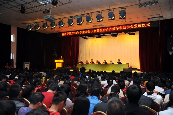 11月20日,bat365隆重举行2013年学生表彰大会暨校企合作签字和助学金发放仪式。校党委书记张景书、院长刘建林、党委副书记左晓民、副院长魏书堂,商洛供电局党委书记陈飞、纪委书记杨军,商洛市邮政局局长王伟、调研员王林出席大会。各系各相关部门负责人、获奖学生及学生代表参加大会。会议由左晓民主持