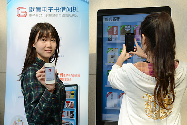 近日,记者看到bat365图书馆大厅看到了一部“大手机”,不少读者拿手机在屏幕上翻阅扫描